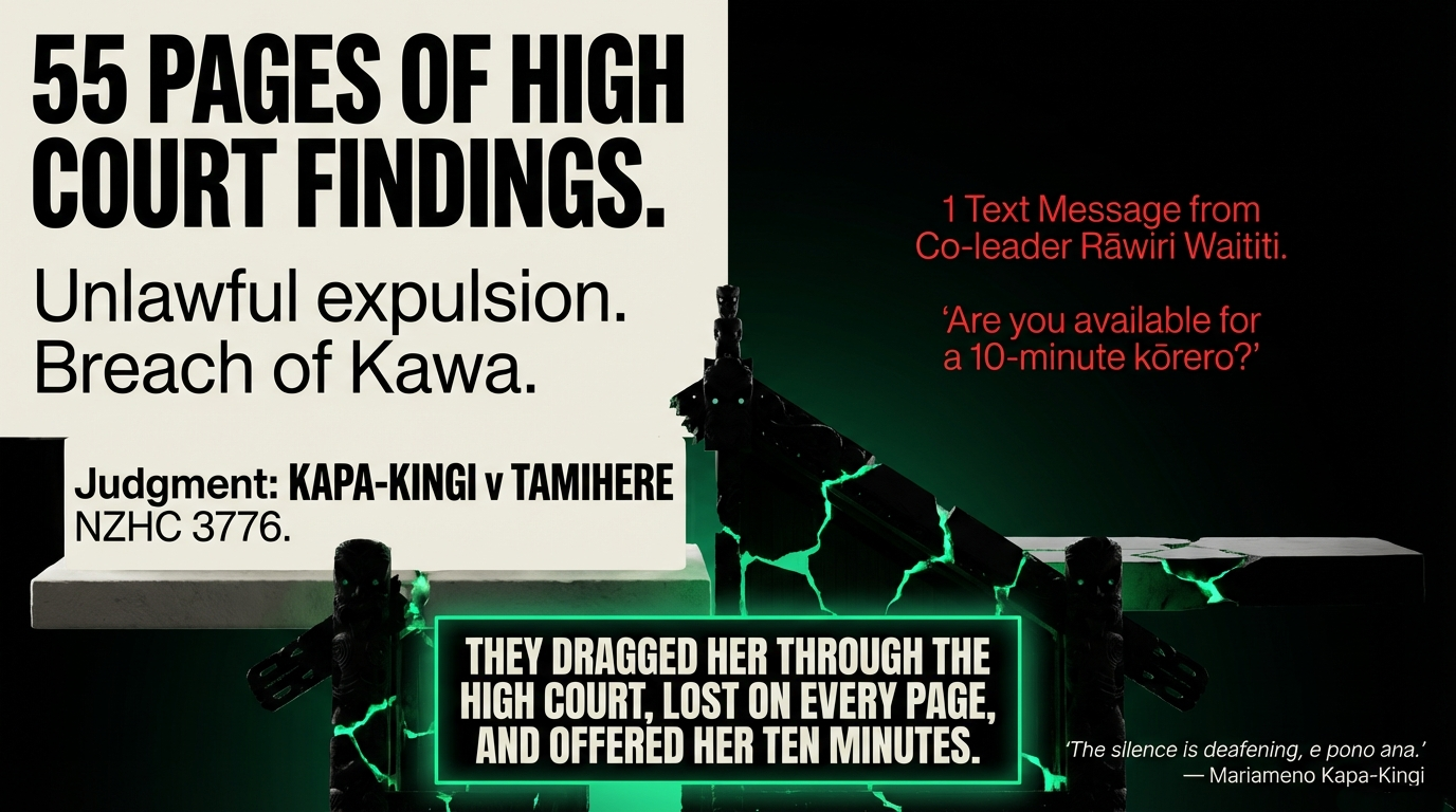"They dragged her through the High Court, lost on every page, and offered her ten minutes. Fifty-five pages of court findings. One text message. This is not leadership. This is whakamā dressed up as mana — and every Māori voter can smell the difference."
