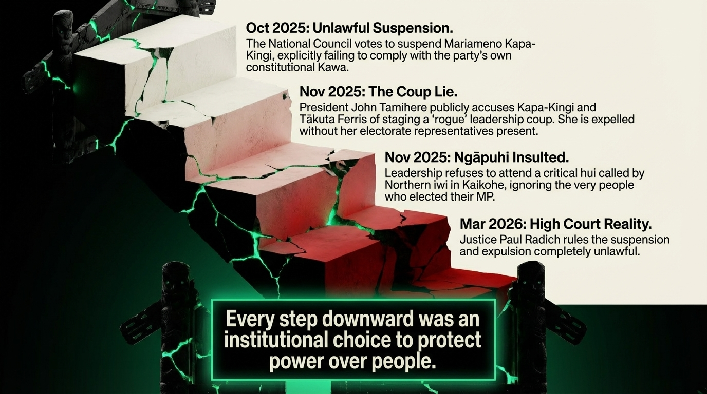 The answers came from Justice Paul Radich. When the High Court issued its judgment, as confirmed by Waatea News, the finding was total and unambiguous: Te Pāti Māori's National Council had failed to comply with its own Kawa. The resolutions used to suspend and expel Kapa-Kingi were inconsistent with the party's constitution. They were unlawful. Not sloppy. Not procedurally questionable. Unlawful.