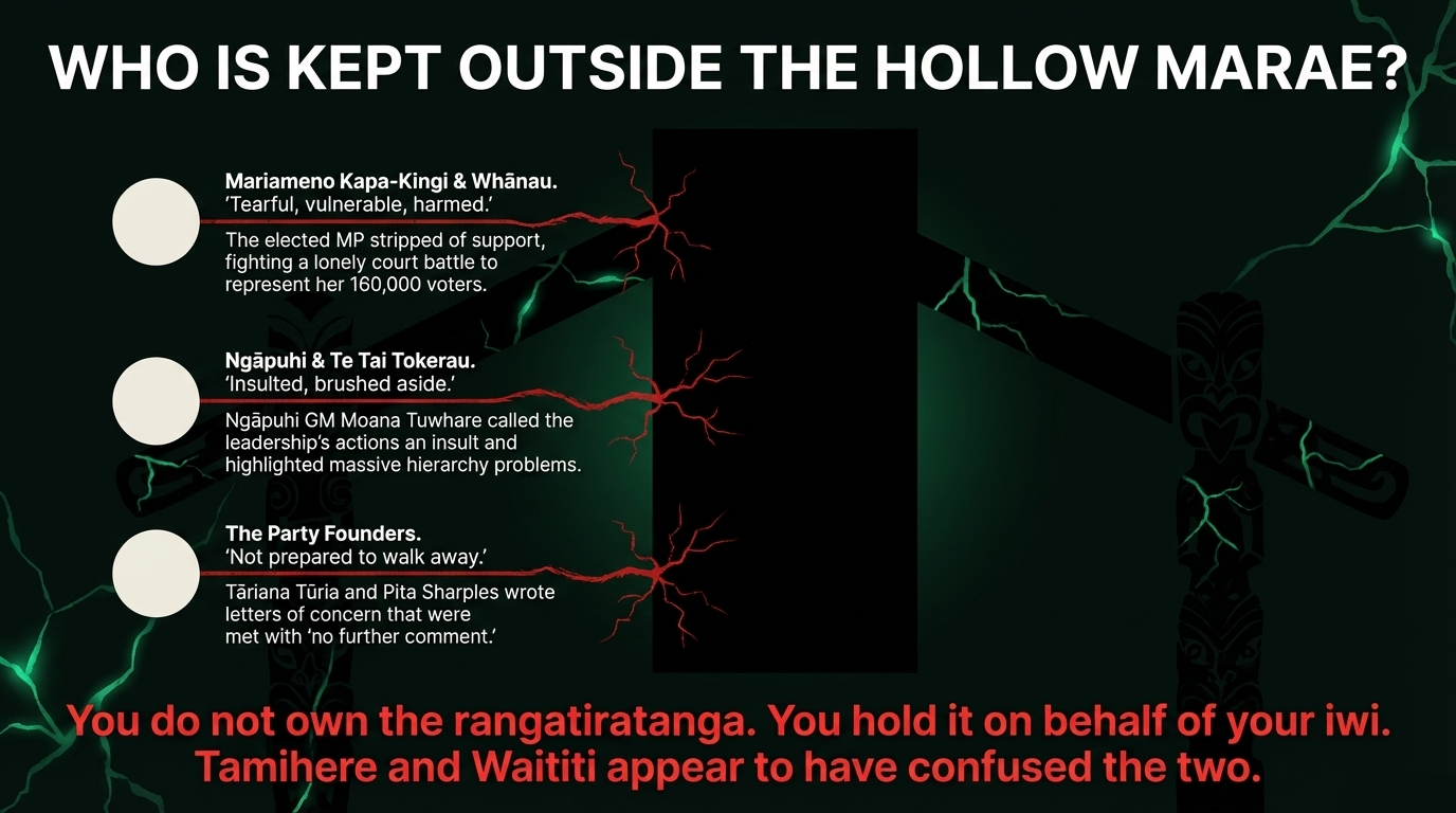 In October 2025, Te Pāti Māori's National Council voted to suspend and then expel its own elected MP for Te Tai Tokerau, Mariameno Kapa-Kingi, without following the party's own Kawa — a process the High Court of New Zealand found unlawful in a 55-page judgment in December 2025, confirmed by reinstatement in March 2026. The party's president, John Tamihere — who publicly accused Kapa-Kingi and Te Tai Tonga MP Tākuta Ferris of staging a "rogue" leadership coup — has not spoken to her since November 2025. Co-leader Rāwiri Waititi's response to the court ruling that vindicated her was a single text message asking if she was available for a "10-minute kōrero." No apology. No wānanga. No acknowledgment of harm.