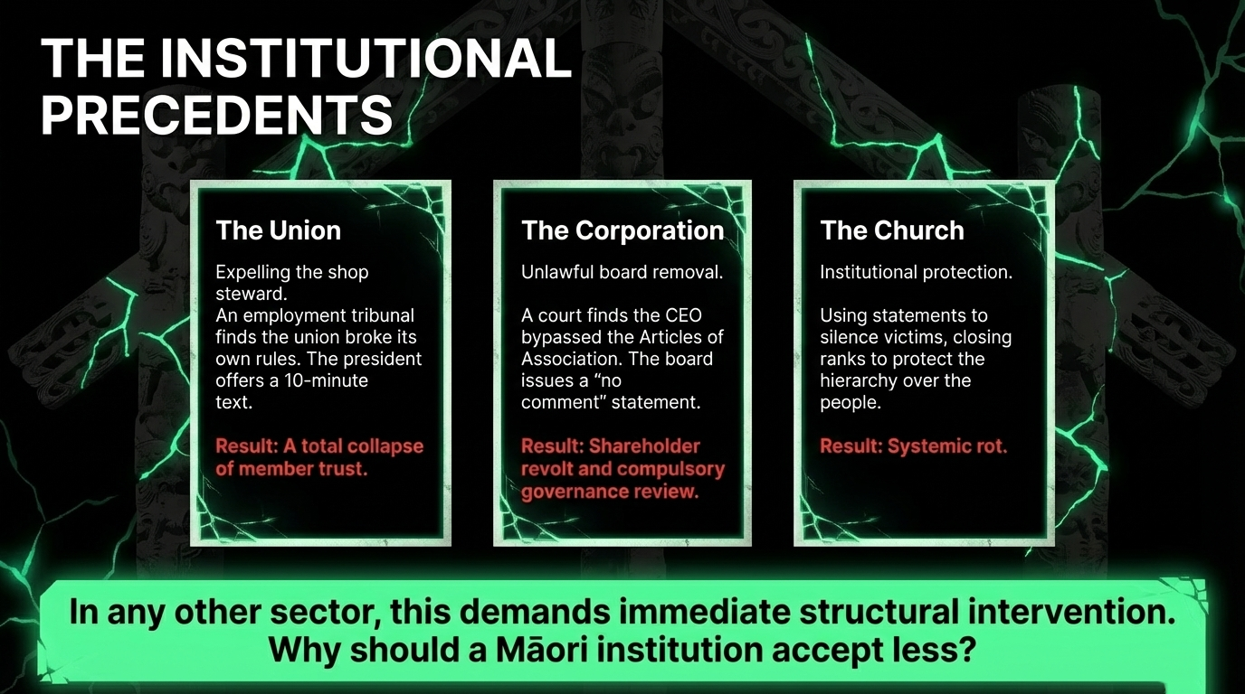 Every corporate governance expert and business law student knows this is not how you restore institutional trust after a legal finding of unlawful conduct. The board would face an extraordinary general meeting, a shareholder revolt, compulsory governance review, and — if the conduct was sufficiently damaging — legal costs, director liability assessments, and formal accountability mechanisms. Te Pāti Māori has avoided all of this. Not because the situation doesn't demand it. Because silence protects their positions.