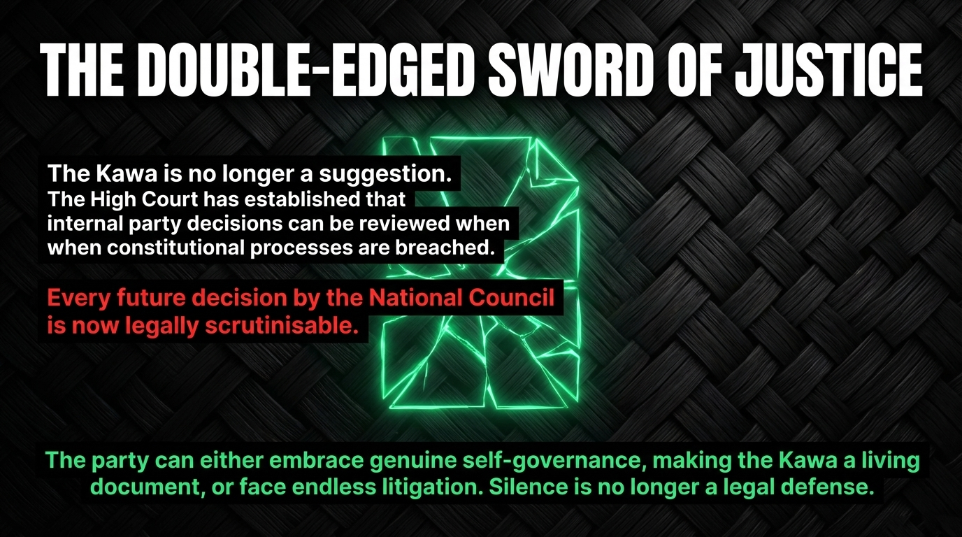 Tikanga impact: The High Court's finding, as Tea O News reported, is a significant constitutional precedent: courts can review internal party decisions when parties breach their own constitutional documents. The Kawa is now a legally enforceable taonga. Every future decision by the National Council is scrutinisable. The party can either embrace this accountability — making the Kawa the living, breathing document of genuine self-governance it was designed to be — or it can continue to treat it as a suggestion and face further litigation. Genuine tikanga governance requires the former. The current leadership's behaviour suggests the latter.