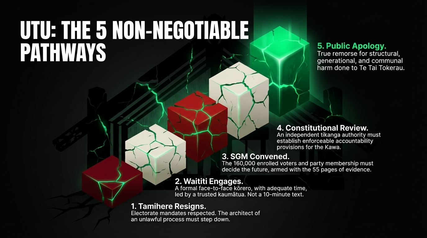 Every employment relations expert in the country would recognise this as a governance failure requiring structural intervention. The quantified harm is electoral: Te Pāti Māori holds seats representing approximately 160,000 enrolled Māori voters. A Spinoff analysis from March 2026 raises serious questions about the party's viability in the next election if unity is not restored. The solution: an SGM, full disclosure, a formal apology, and a constitutional review conducted by an independent tikanga authority.