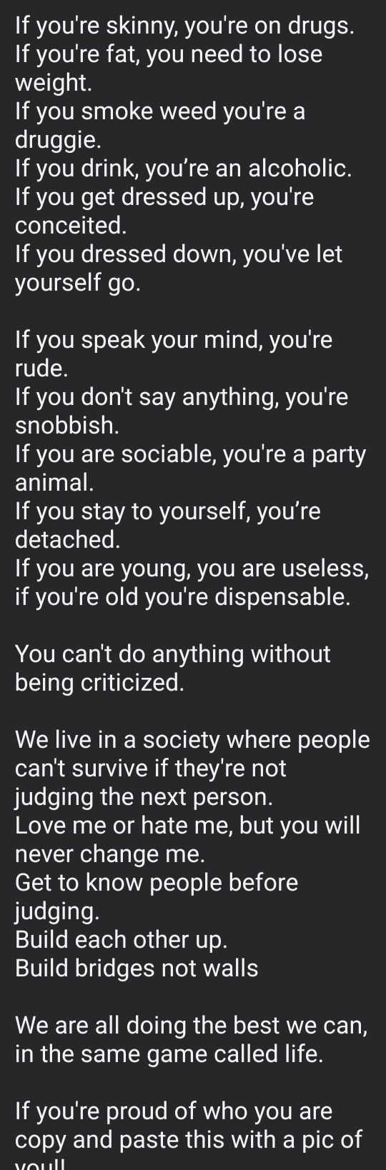The social media post presents a litany of supposed societal judgments, from appearance to lifestyle choices, suggesting that any form of evaluation is inherently wrong. The post concludes with the seemingly progressive message that we should "build each other up" and "build bridges not walls." However, this superficial wisdom masks a profound misunderstanding of how healthy communities function.