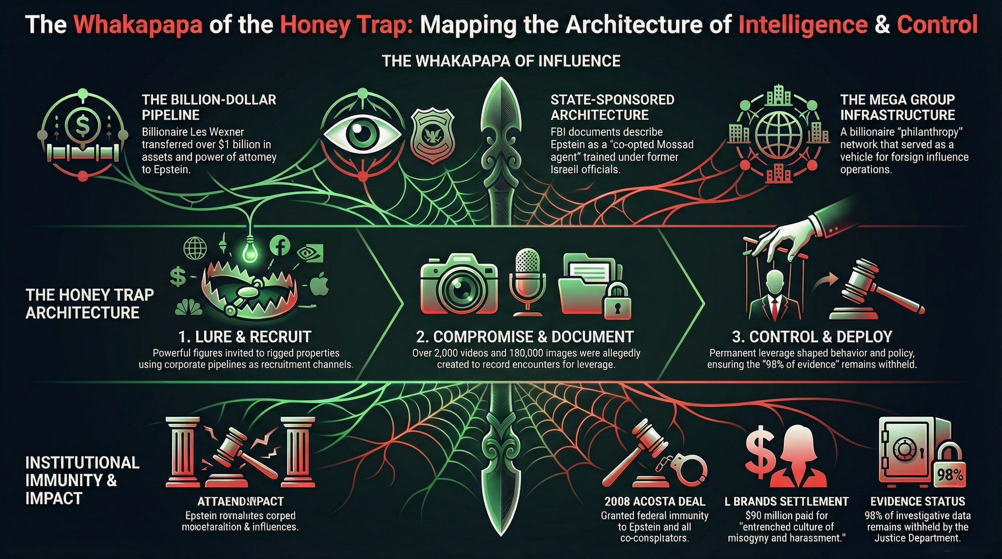 In January 2026, the US Justice Department released over 3 million pages of Epstein documents, including more than 2,000 videos and 180,000 images. What they reveal is not merely the depravity of one man. They reveal the whakapapa of a honey trap operation — a genealogy of blackmail stretching from a billionaire's Ohio mansion to the corridors of Israeli intelligence to the bedrooms of world leaders.