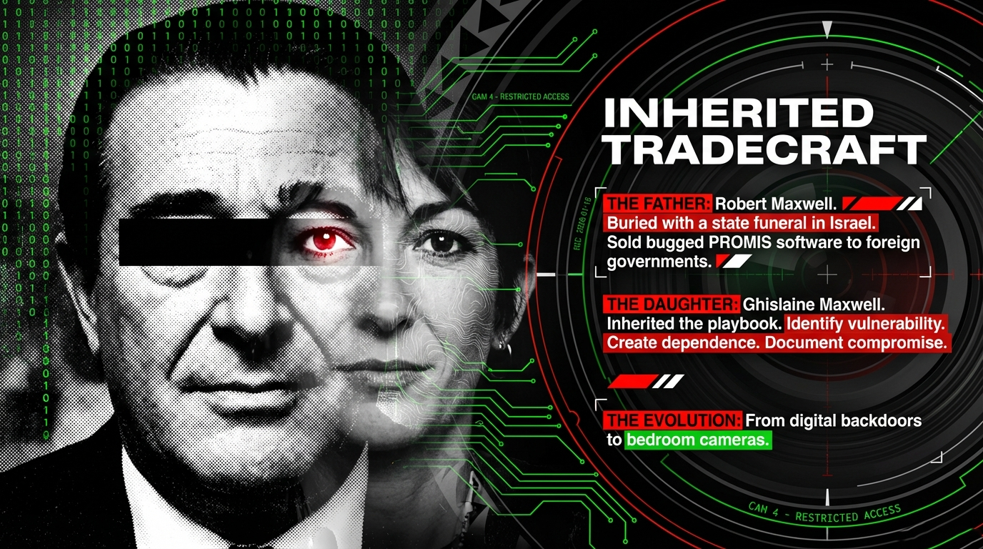 Connection Three: The Robert Maxwell-PROMIS-Surveillance Lineage. Maxwell sold bugged software globally for Israel. His daughter facilitated bugged bedrooms globally for Epstein. The surveillance methodology — plant technology, document everything, deploy leverage — is inherited operational doctrine. Father to daughter. PROMIS to hidden cameras. This is intelligence whakapapa.