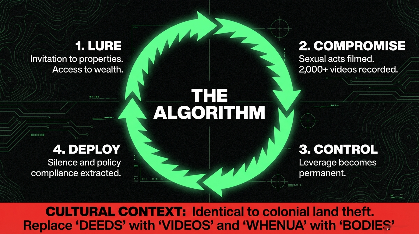 In te ao Māori, we recognise this pattern intimately. The colonial Crown operated identically: lure rangatira into "negotiations," document their "consent" on fraudulent deeds, control their lands through imposed "legal" frameworks, deploy the Native Land Court to enforce compliance. The methodology is identical. Only the currency changes: from whenua to bodies, from deeds to videos.