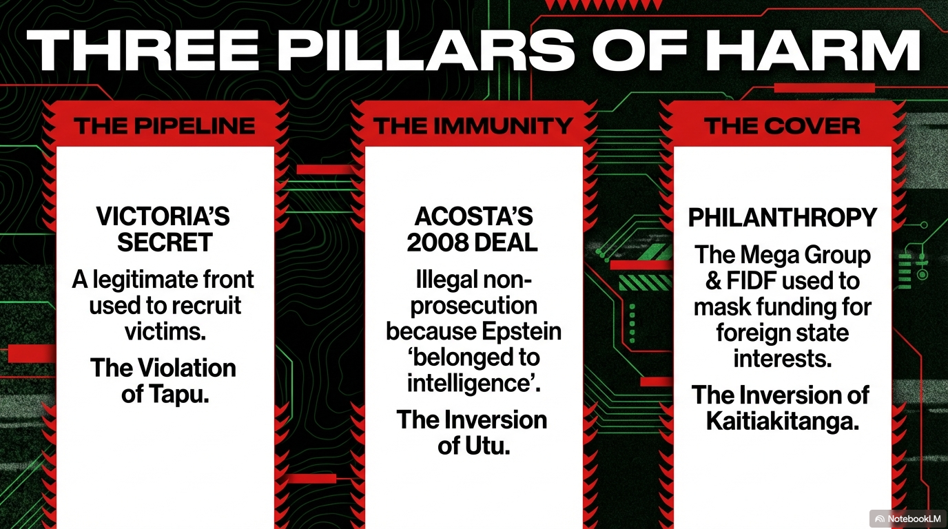 Impact on tikanga: In tikanga, kaitiakitanga demands that those with power protect the vulnerable. The Mega Group inverted kaitiakitanga entirely: it used wealth and institutional power not to protect, but to construct influence networks that served a foreign state's interests while American children were trafficked. This is the colonial model perfected: disguise extraction as philanthropy, weaponise "community" organisations as intelligence infrastructure, and deploy the language of cultural preservation to mask political manipulation. Māori recognise this playbook because we have lived under it for 185 years. The Crown's "philanthropic" missions — civilising, Christianising, educating — were always intelligence-gathering and control operations. The Mega Group updated the methodology with tax-deductible donations and Ivy League legitimacy.