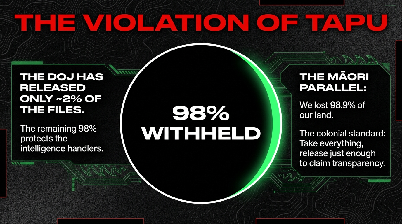 Connection Five: The 98% Withheld. The DOJ has released approximately 2% of total investigative data. The Epstein Files Transparency Act mandated release of "all unclassified records." Deputy AG Todd Blanche — Trump's former personal lawyer — insists "DOJ is hiding nothing." Yet names continue to be redacted, documents withheld, and investigations stonewalled. The 98% that remains hidden is the 98% that would expose the full intelligence operation. In Aotearoa, Māori lost 98.9% of ancestral lands through colonial "legal" mechanisms. The percentage is not coincidence — it is the standard operating ratio of colonial extraction: take nearly everything, release just enough to claim transparency.