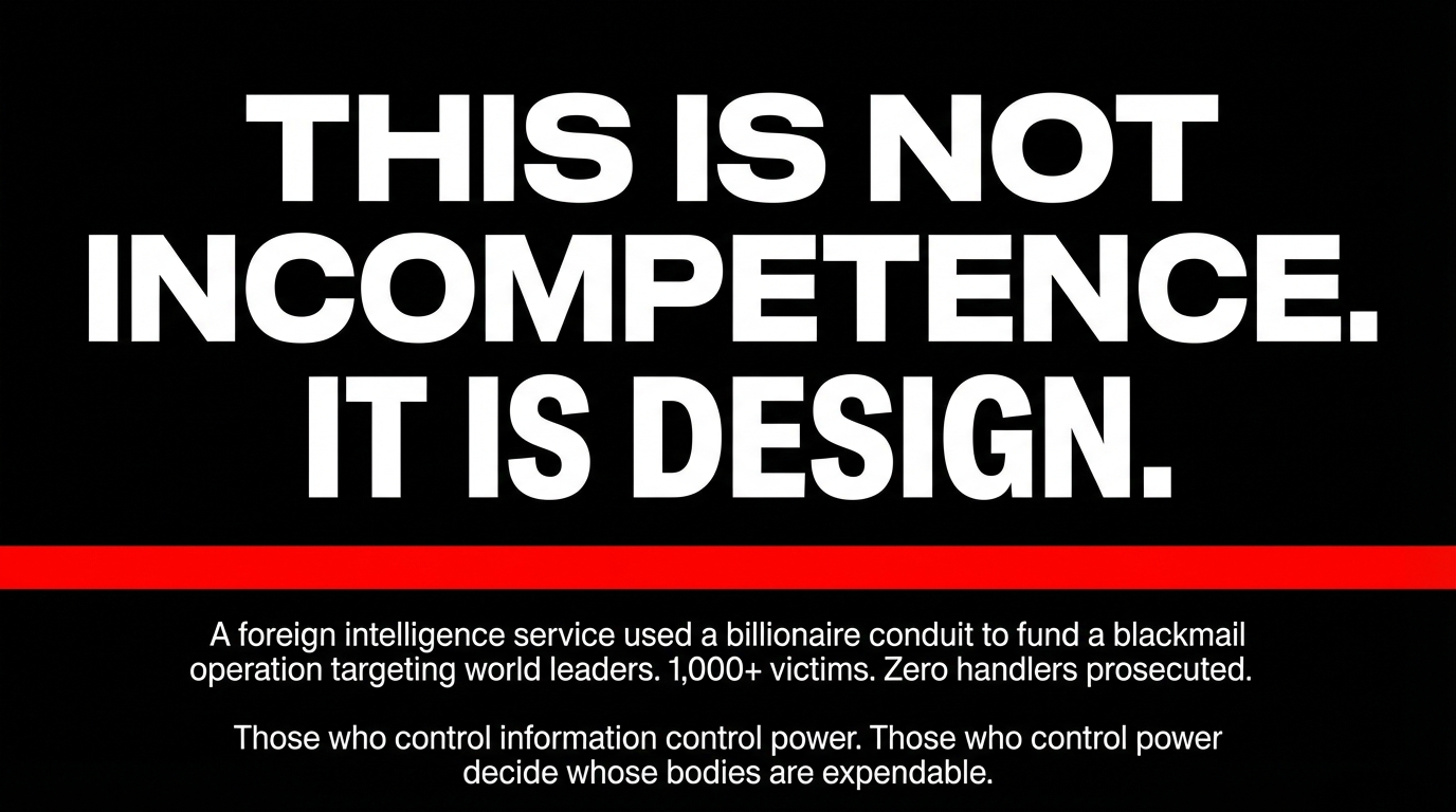 - "Steve Bannon, Jeffrey Epstein, and the Whakapapa of Impunity" — which exposed Bannon's 15 hours of documentary footage with Epstein and the dual architecture of institutional and narrative impunity. This essay completes the triptych by revealing the third layer: intelligence impunity — the shield that made both legal and media immunity possible.