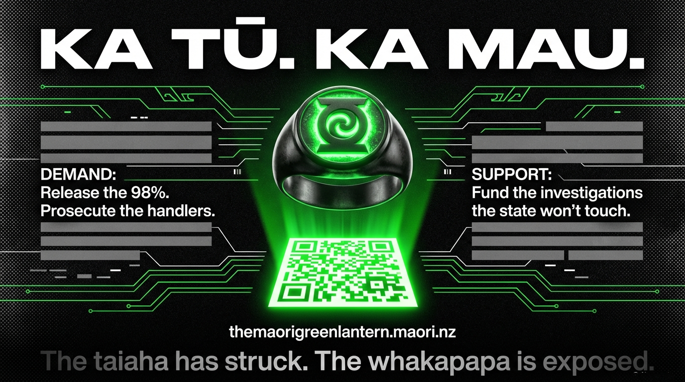 - The Māori Green Lantern connecting this global scandal to colonial structural analysis (integrates mātauranga Māori with international accountability)
