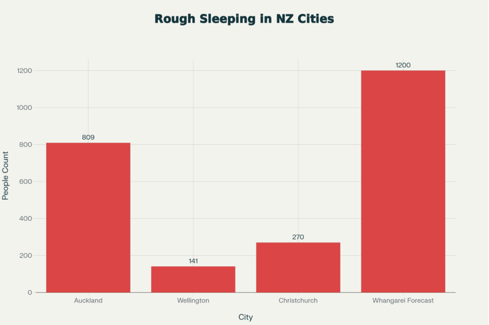 - Auckland: 809 unsheltered people by late 2024—a 90 percent surge from 426 in September 2024 as reported by The Spinoff.