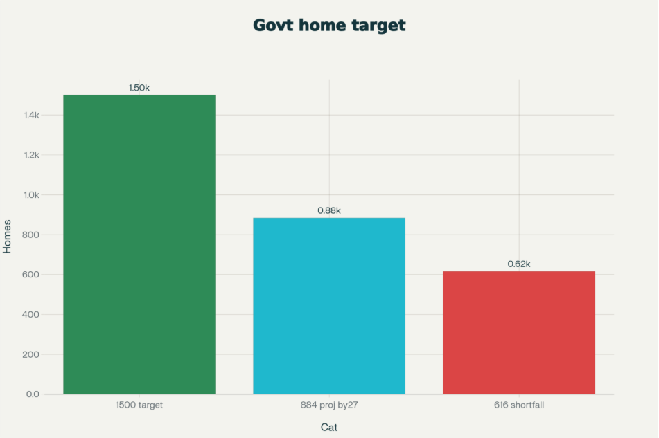 The arithmetic is inescapable: 337 + 147 (homes from 2026/27 before deadline) = 484 homes by the June 2027 deadline. The promised 1,500 will never materialise. Bishop’s response was to admit “there’s always the risk of slippage” as quoted by RNZ—an admission of failure dressed as inevitability.