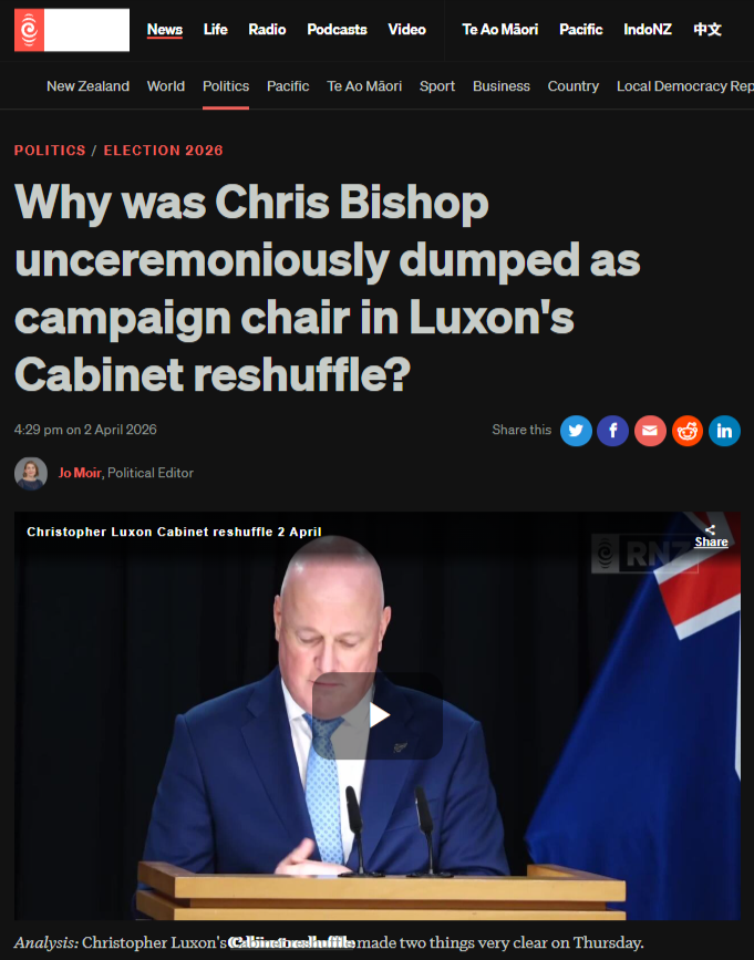 https://www.rnz.co.nz/news/political/591377/why-was-chris-bishop-unceremoniously-dumped-as-campaign-chair-in-luxon-s-cabinet-reshuffle; https://www.rnz.co.nz/news/political/591342/prime-minister-christopher-luxon-announces-election-year-cabinet-reshuffle; https://www.rnz.co.nz/news/political/591181/who-the-winners-and-losers-of-christopher-luxon-s-election-year-cabinet-reshuffle-might-be