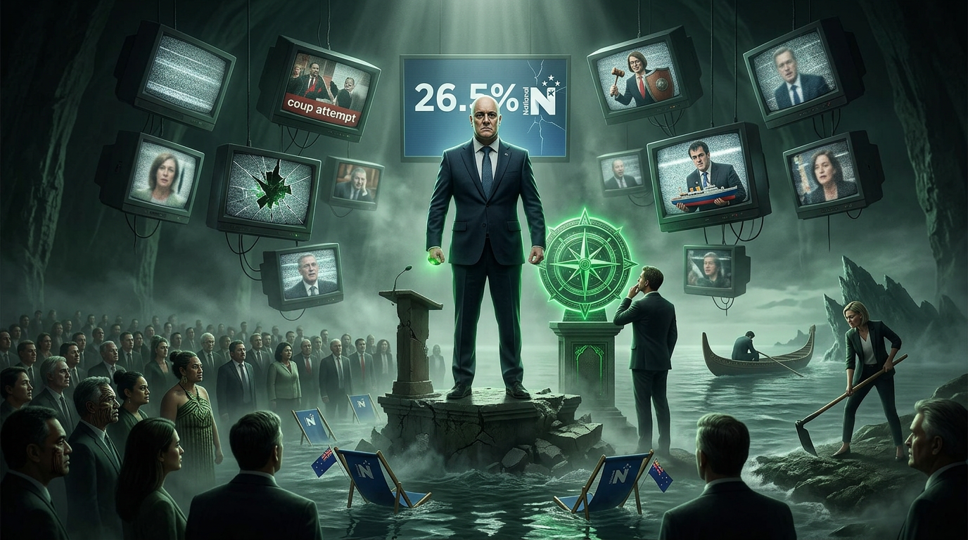 On April Fools' Day, Christopher Luxon stood before the cameras and performed strength. Behind him: National at 26.5%. A coup attempt from within his own ranks. A campaign chair handed to a loyalist over a strategist. An Education Minister left armed and watching. A new Defence Minister whose primary qualification is enthusiasm and a naval background Luxon cannot even detail. A new Leader of the House who missed her own bill's first reading and lowered child poverty targets — then missed those too. A Pākehā man handed the Pacific Peoples portfolio. A coalition dead level with the opposition. And 56% of the country telling every available pollster that New Zealand is going in the wrong direction.