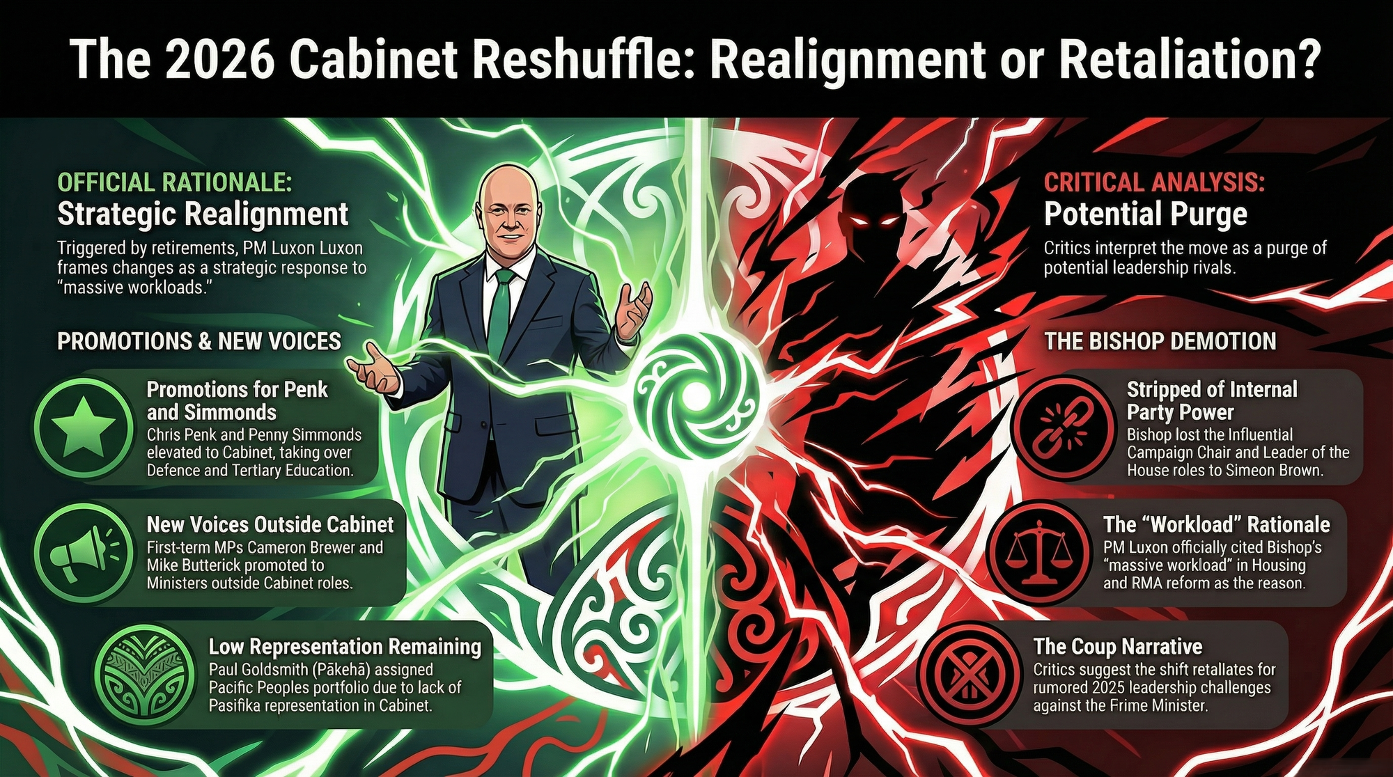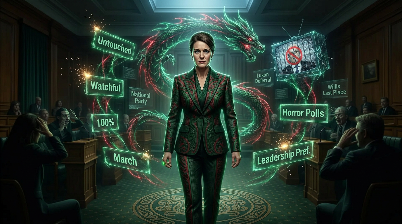 Luxon did not reshuffle his cabinet. He performed a tohu — a dark sign — that told the whole nation exactly where this government stands: cornered, frightened, and cannibalising itself. And to fill the gaps left by his purge of Bishop, he promoted two loyalists whose records reveal exactly why this government is on track to become the first one-term National government in over fifty years.