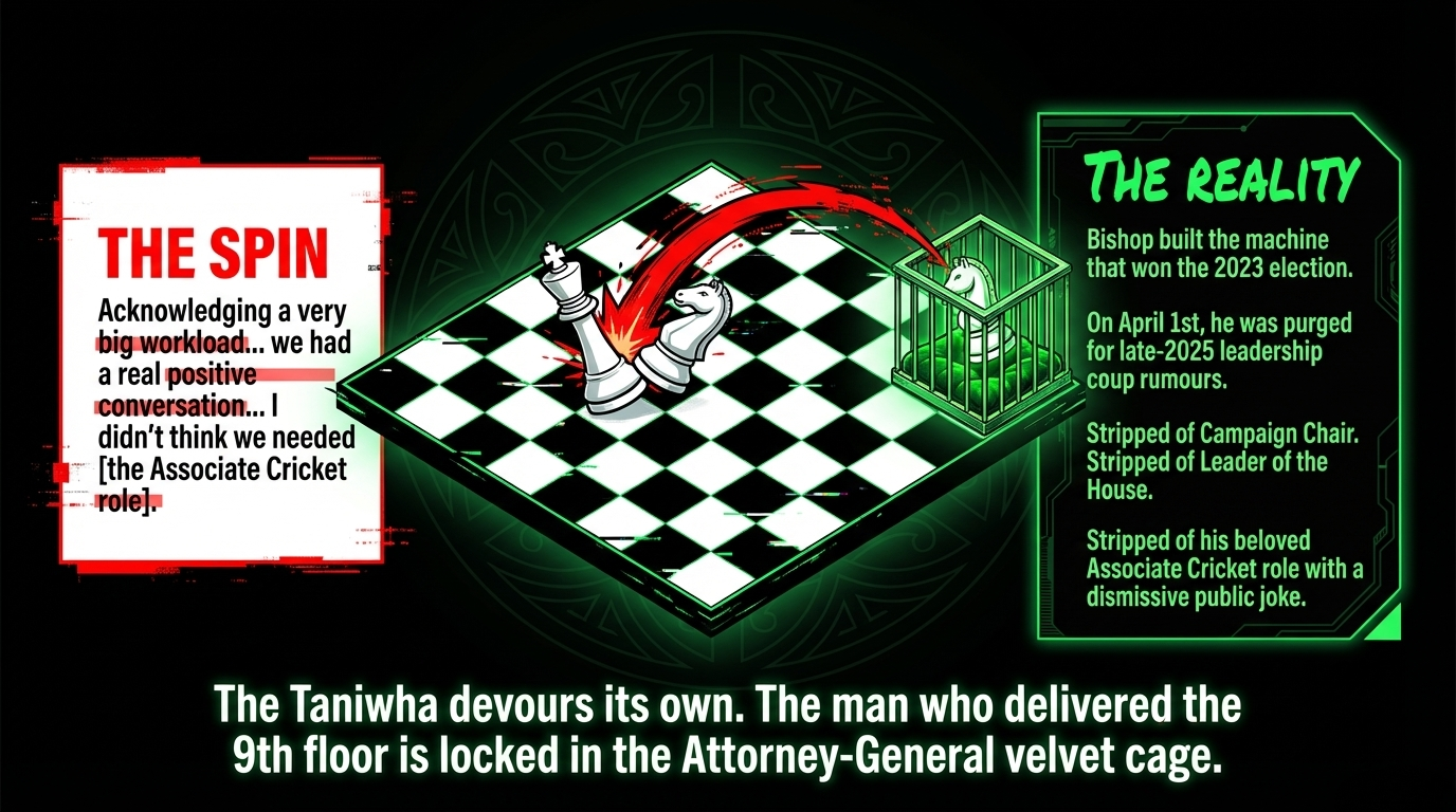 And then came the final cut — the cruelest insult. Luxon eliminated Bishop's Associate Minister role for cricket — the only portfolio Bishop reportedly held with genuine personal joy.
