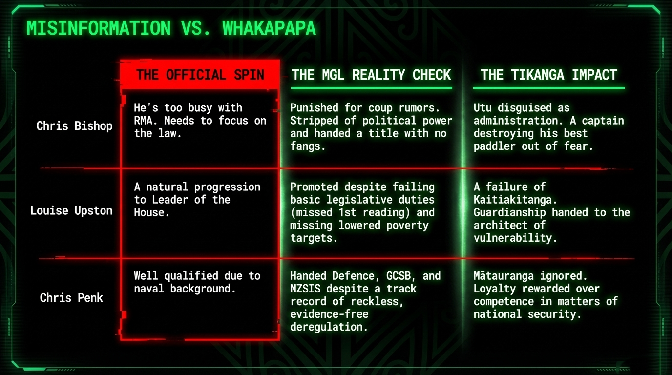 Tikanga lens: In Māori leadership, mātauranga — the depth and breadth of knowledge — determines fitness for a role. You do not hand the taiaha of national intelligence to someone whose primary qualification is enthusiasm and loyalty. Kaitiakitanga of a nation's security requires demonstrated wisdom, not demonstrated compliance. Penk has not been tested at this level. He is being tested at it — in real time, with real stakes — because Luxon needed to fill the vacuum left by Judith Collins and had no one better available who also happened to be loyal.