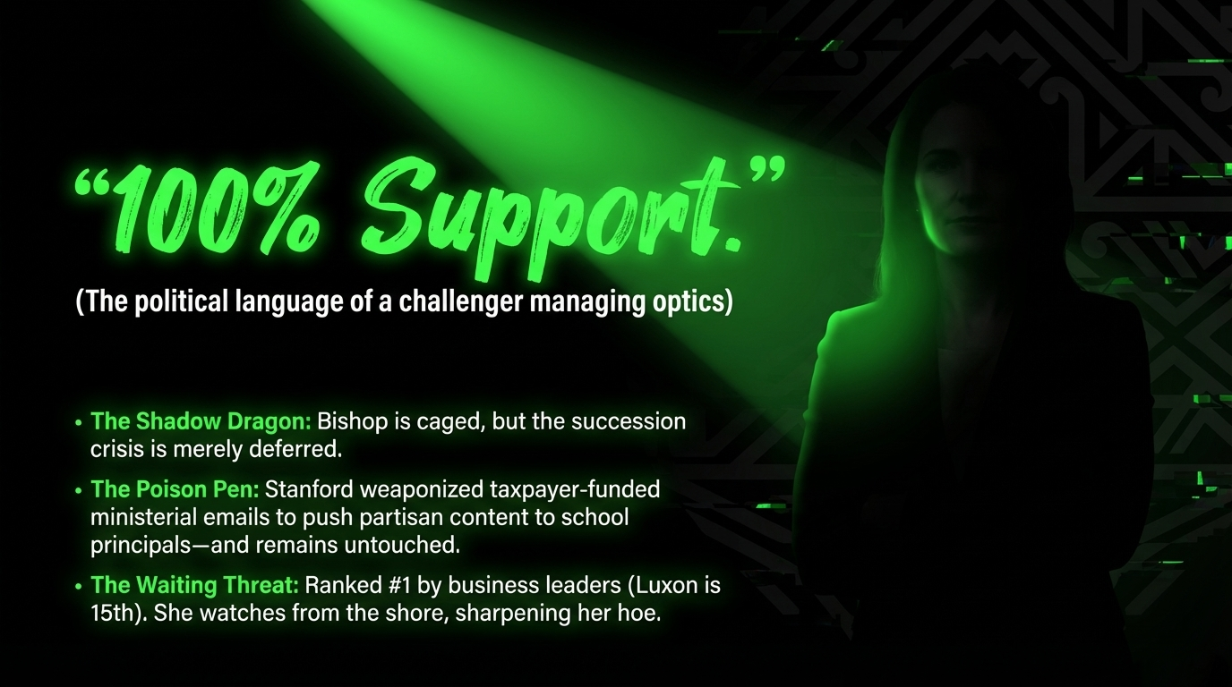 Erica Stanford remains in Cabinet, untouched and watchful. As Newstalk ZB confirmed, after the March horror polls Stanford publicly described it as "a bad week for the National Party" while pledging support for Luxon "100%." That declaration — unsolicited, performed for cameras — is the political language of a challenger managing optics, not a loyal deputy offering comfort. In a November 2025 leadership preferences poll, Bishop edged Stanford at the top while Luxon and Willis competed for last place. With Bishop caged, Stanford is the last dragon standing — and she knows it.