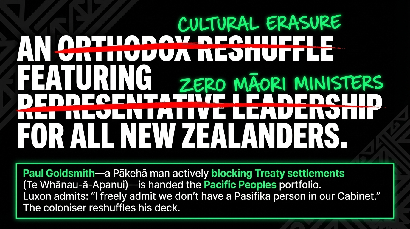 Paul Goldsmith — a Pākehā man who, as Minister for Treaty Negotiations, has been actively blocking and undermining Treaty settlements — has been handed the Pacific Peoples portfolio. As Te Ao News confirmed, the reshuffle "raised fresh questions about representation at the Cabinet table." That is a polite way of saying: this government just handed responsibility for Pacific communities to a man with zero cultural connection to those communities and an active track record of subordinating the Treaty rights of Māori.