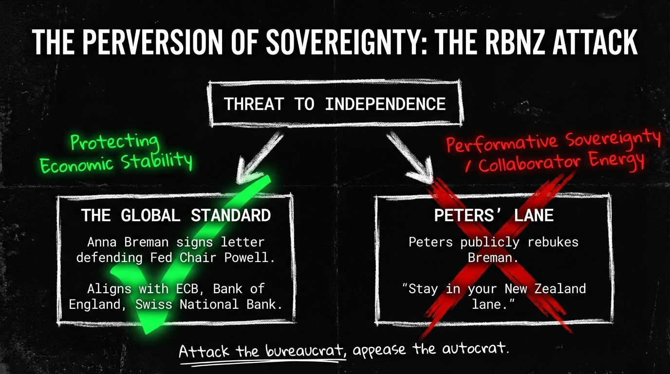 The Problem: Anna Breman was publicly rebuked for defending central bank independence—a principle fundamental to New Zealand’s economic security. This creates a chilling effect: officials learn that defending institutional integrity against foreign threats will get them attacked by their own ministers.