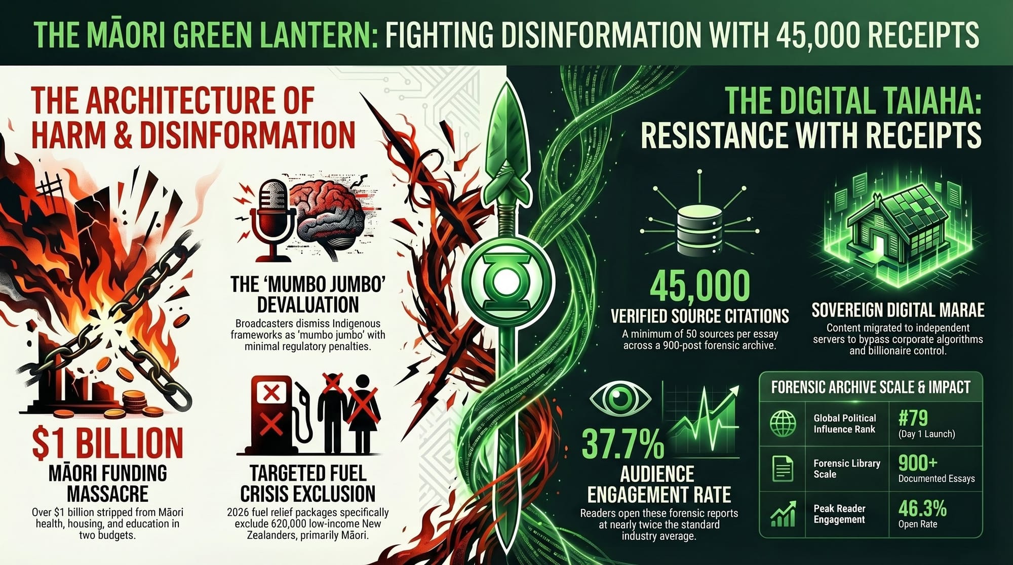For Te Māori Green Lantern, that whakapapa is now 900 essays deep, published at a cadence that breaks every conventional publishing rule and keeps breaking it — because the harm being documented does not pause for the weekend, and neither does this publication.