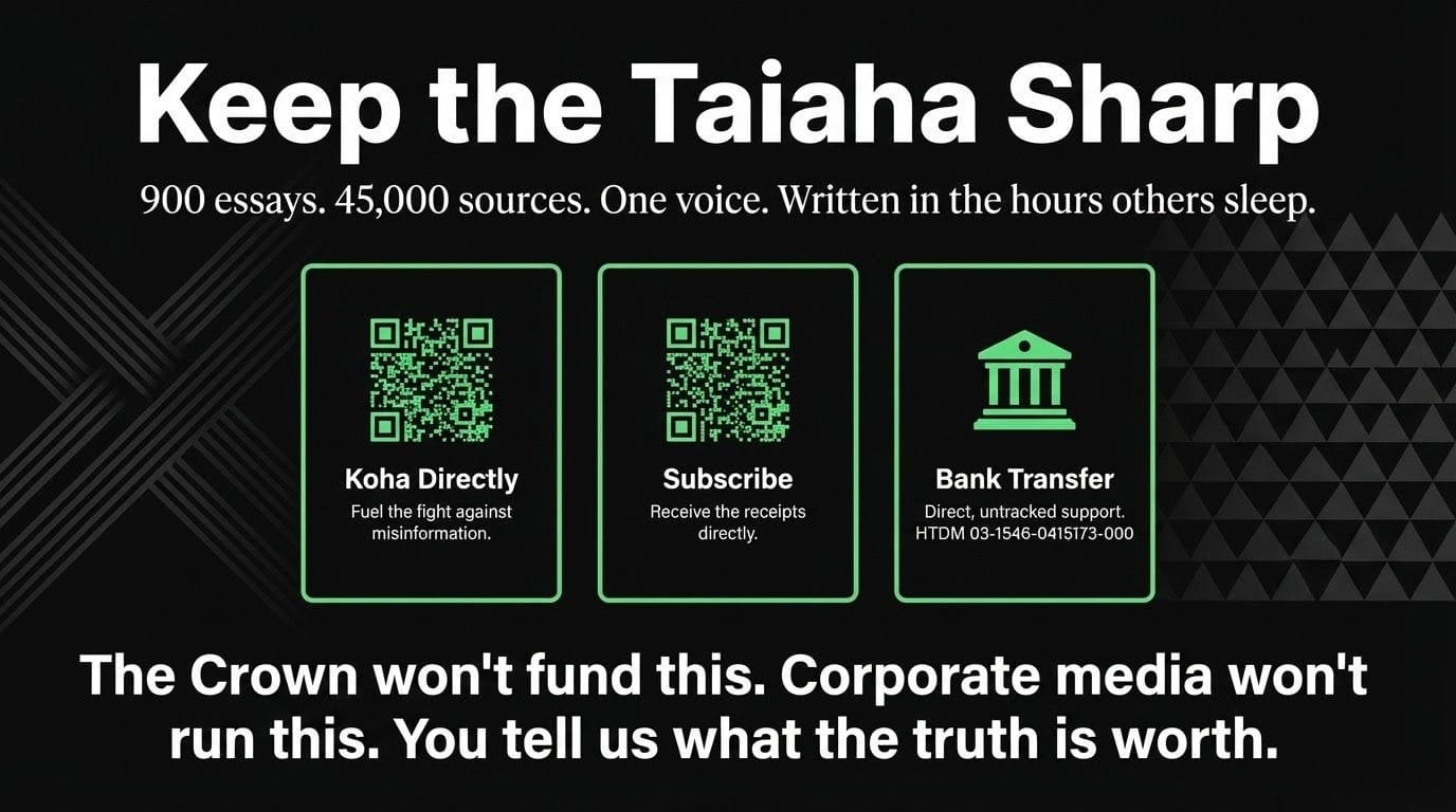 The Crown is not going to fund this. The corporate media is not going to run this. NewstalkZB is not going to award a journalism prize to the person who named their network as a laundering service for racist polling. The $3,000 BSA fine for calling tikanga "mumbo jumbo" tells you exactly what the institutional media thinks Māori culture is worth.