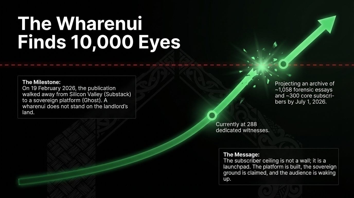 This publication crossed position 79 globally (substack) in political influence on Day 1 with no paid promotion. It survived a direct SLAPP attempt by publishing harder. It built a sovereign digital marae while the rest of Aotearoa's independent media negotiated with landlords. The Ko Wai Mātou reckoning was not the destination. It was an invitation. The subscriber ceiling at 300 is not a wall. It is a launchpad for every person who shares a single essay with a single whānau member who didn't know this publication existed.
