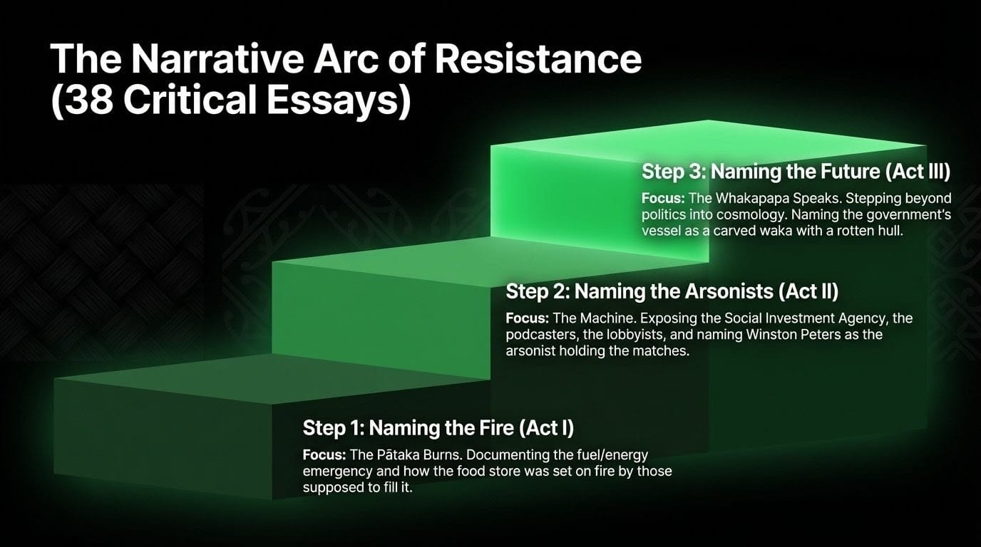 Every single essay in this archive was written in the hours that other people sleep, grieve quietly, and accept. Every essay that named Simeon Brown by name, traced the architecture of the $1 billion Māori funding massacre, exposed the Plunket-Peters broadcasting machine, documented the dying in Te Tāhū o Te Rā, and stood in the way of the SLAPP — was written by one person, on a sovereign digital marae that runs because people like you decided that Māori truth-telling is worth funding.