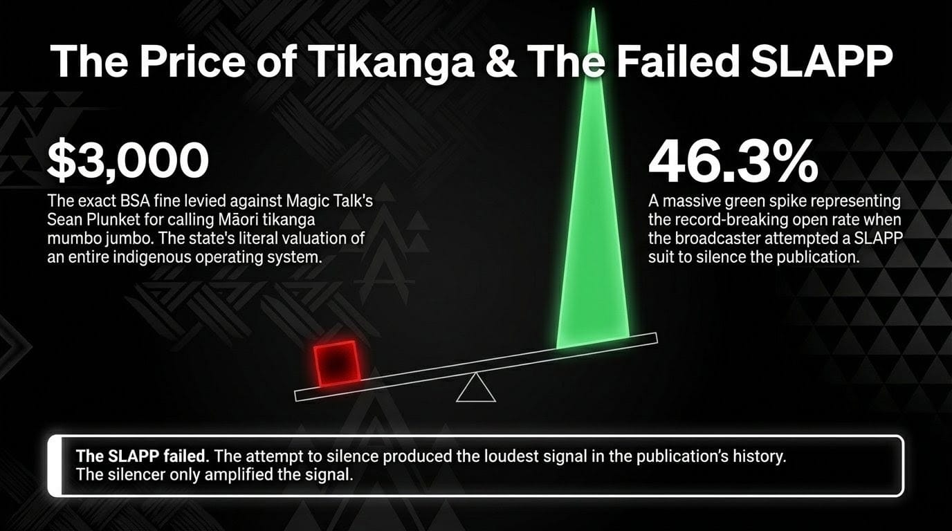 And when Plunket called the Māori Green Lantern directly, in what When a Racist Broadcaster Dials My Phone named as the SLAPP playbook of the white supremacist right, the publication did not go quiet. It published harder. The post generated the highest open rate in the archive's measurable history: 46.3%. The Māori community was watching. And they showed up.