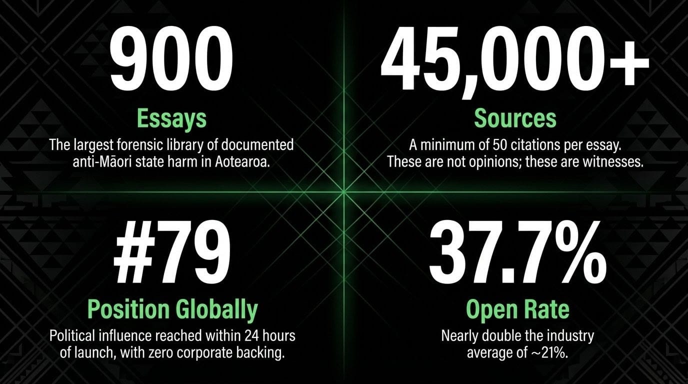 Every essay is backed by the whakapapa of 50+ sources, the kōrero of ancestors who refused to kneel at Parihaka, and the mana of a readership that opens its emails at nearly twice the industry average — not because they have to, but because they have been waiting their entire lives for someone to say this out loud, with receipts.