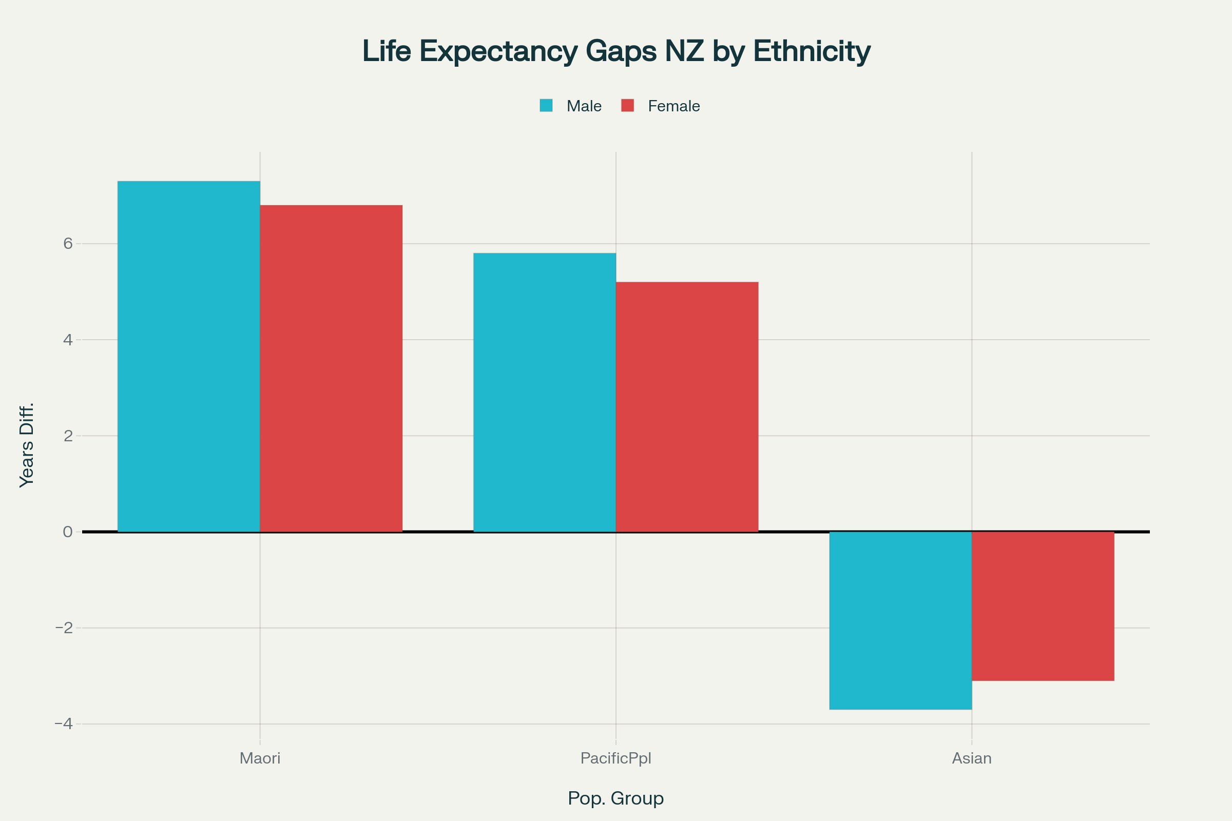 Life expectancy gaps showing how many fewer years Māori and Pacific peoples live compared to Europeans, while Asians live longer