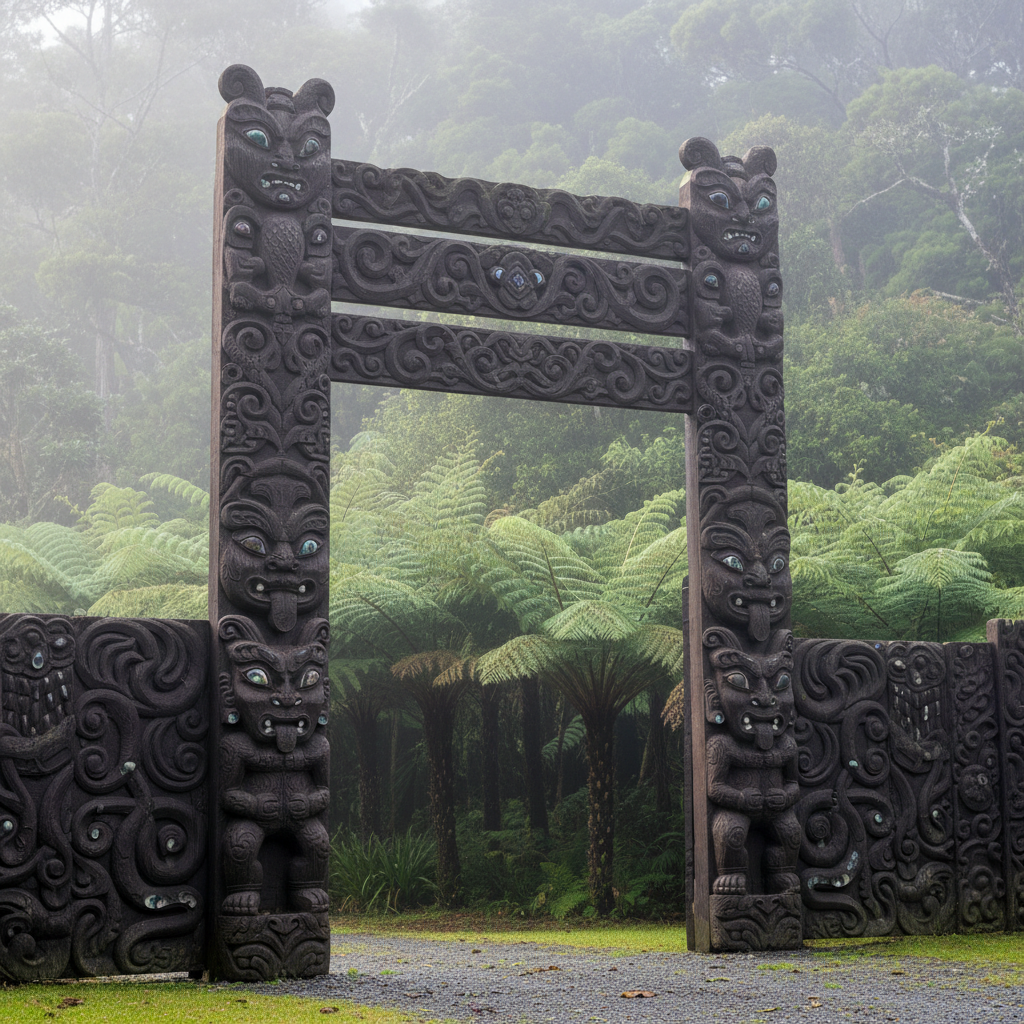 A traditional Māori waharoa (gateway) standing resilient, symbolizing mana motuhake and indigenous sovereignty