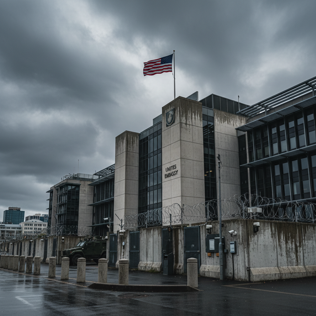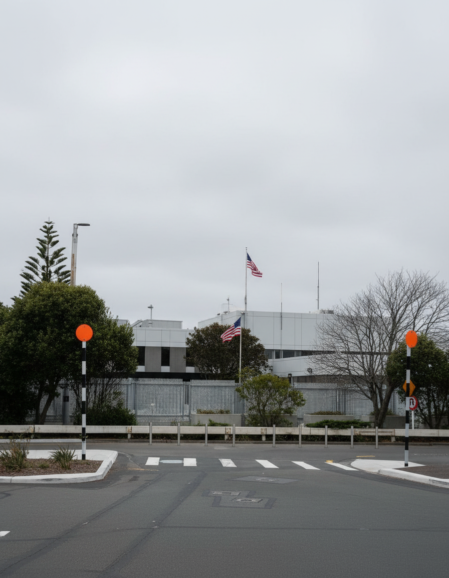 The US Embassy in Wellington under a grey sky, representing the diplomatic pressure from Washington
