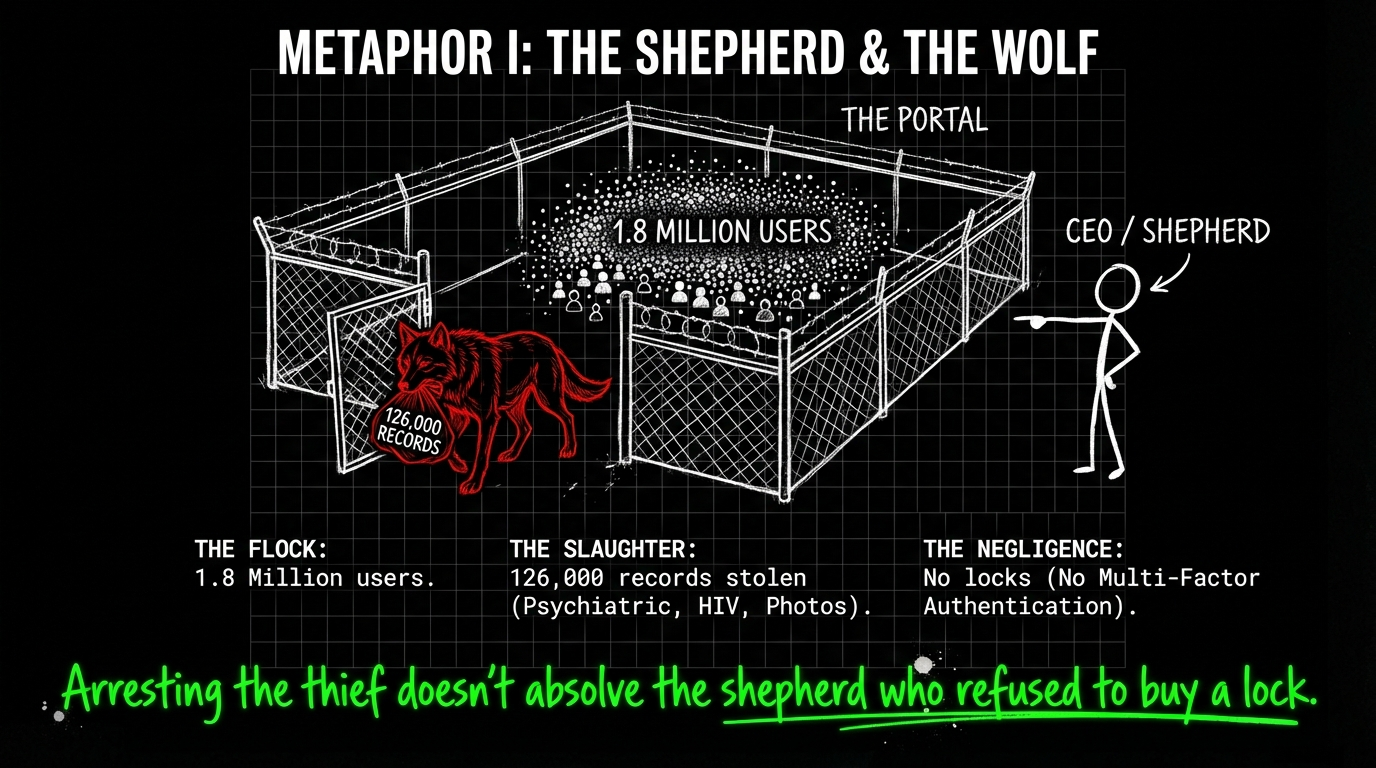Imagine a shepherd (ManageMyHealth CEO Vino Ramayah) who promises to guard a flock of 1.8 million sheep. He builds a fence (the Health Documents module) but refuses to install locks (multi-factor authentication) because locks cost money.