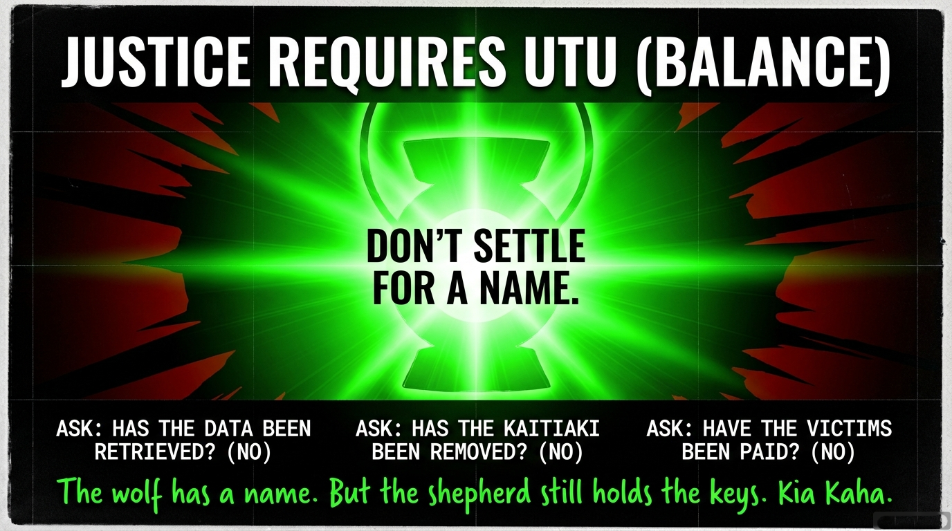 The wolf has a name. The kaitiaki who left the gate unlocked remains in power. And the only voice refusing to call this “progress” is the one your koha keeps speaking.