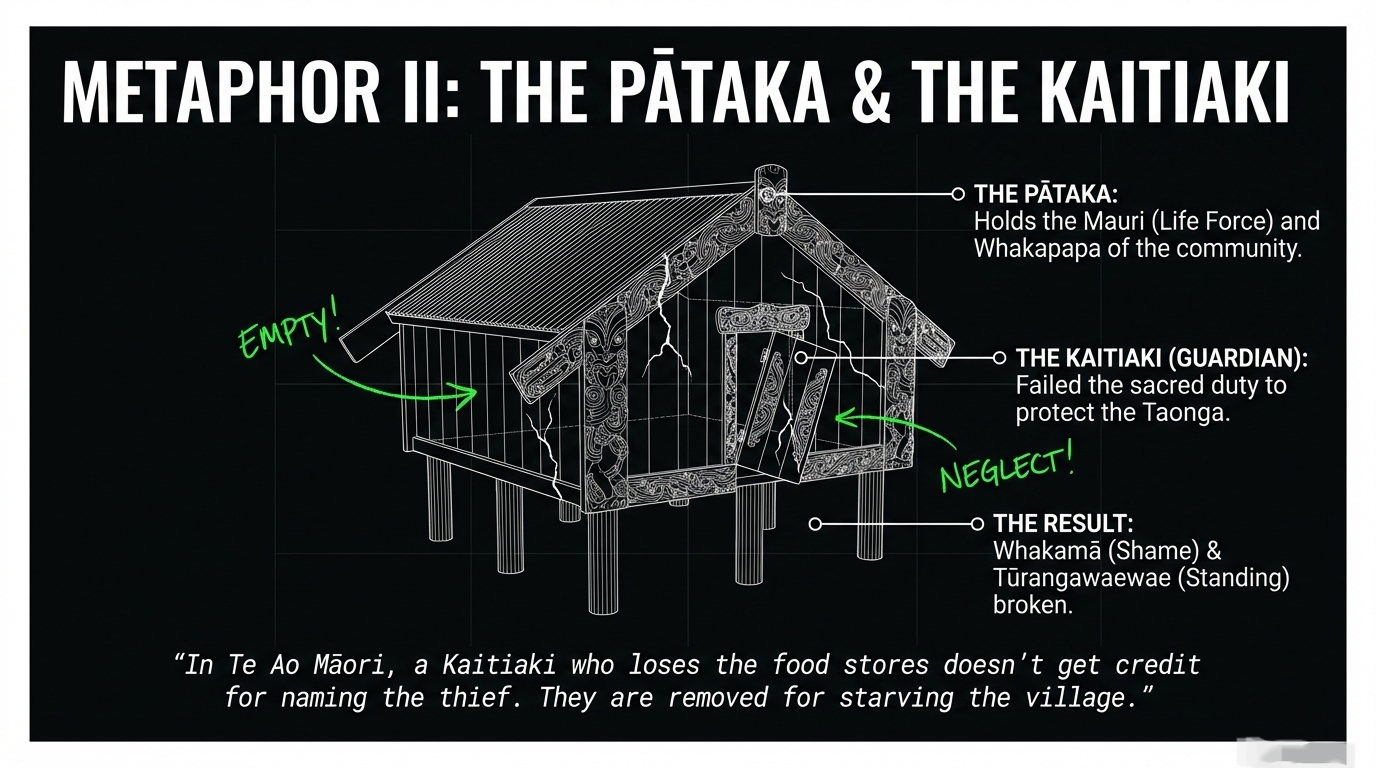 In te ao Māori, the pātaka (storehouse) holds the community’s food—its sustenance, its survival, its mauri. The kaitiaki (guardian) is entrusted with a sacred duty: