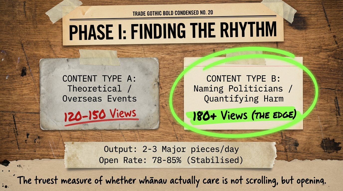 By August, my rhythm had established itself. I was publishing two to three major pieces a day. My posts moved from the 70–90 view range to a consistent 140–170. My email open rates—the truest measure of whether whānau actually care—stabilised between 78–85%. That means four out of five people who received my emails were opening them. Not scrolling past. Not deleting. Opening, reading, thinking.