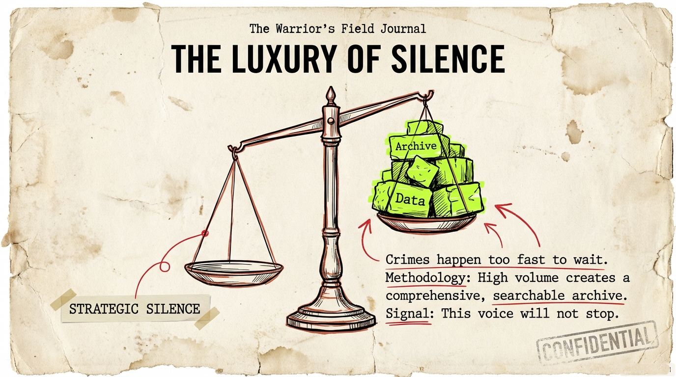 High volume is not a bug in my methodology. It is the methodology. It signals to readers that this voice will not stop, will not compromise, will not strategically retreat. It creates an archive so comprehensive that when someone needs evidence of the Crown’s crimes, they can search my Substack and find it, cited, verified, ready to deploy.