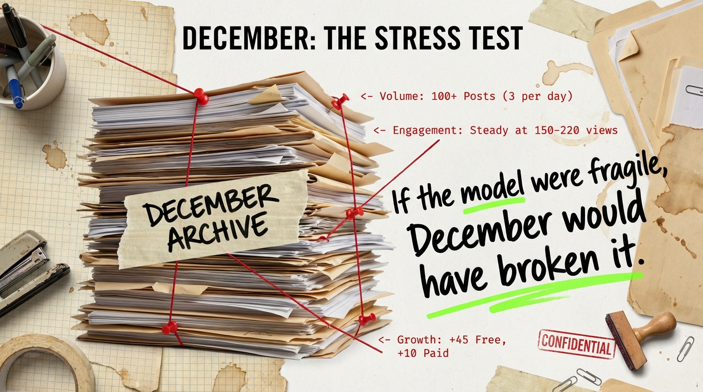 I published more than 100 posts that month. That’s over three pieces a day. Every one of them required research, cross-checking, writing, editing, sourcing. If the model were fragile, December would have broken it.