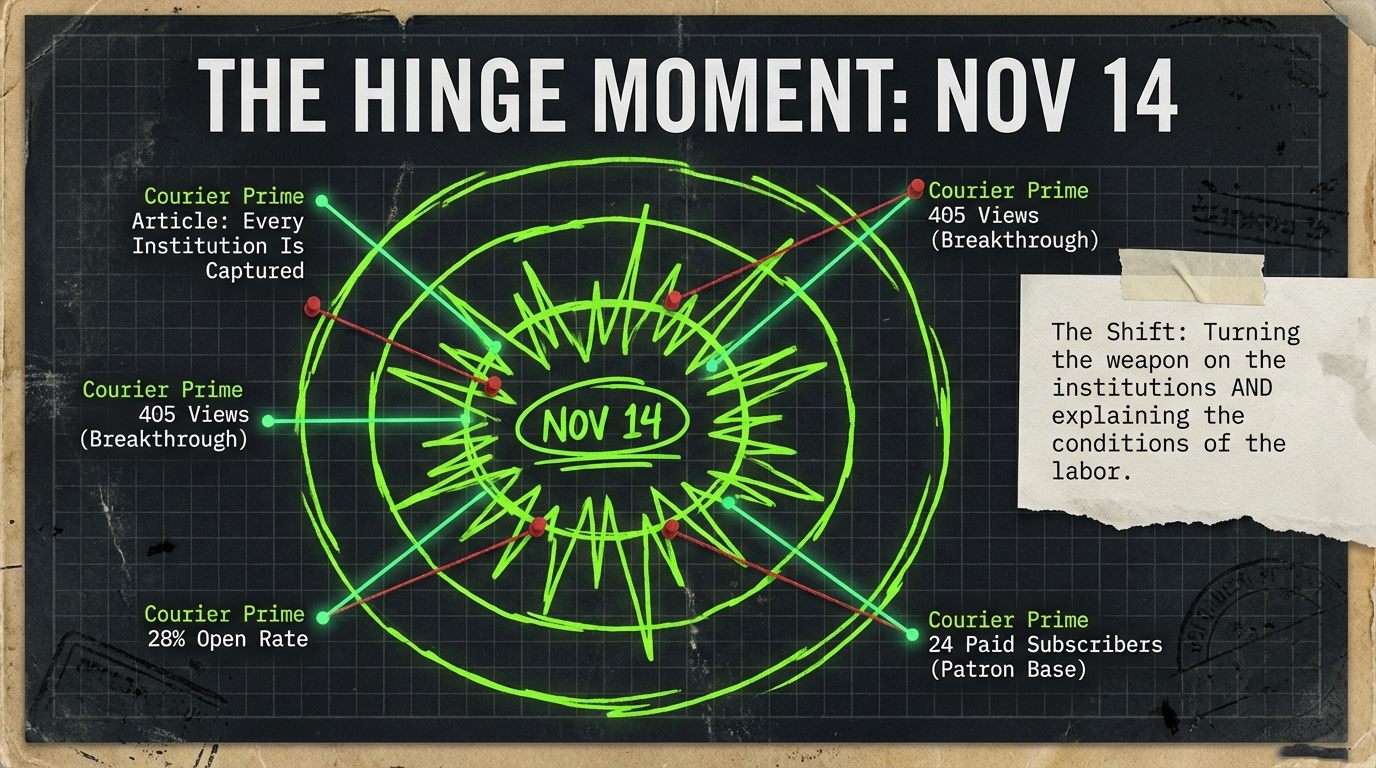 Yes, my November 14 breakthrough post reached 405 views because it had space to breathe, space to circulate, space to accumulate engagement. But that post succeeded because it emerged from a foundation of daily, relentless accountability work. The 405 views were not a product of publishing less. They were a product of having already established credibility, trust, and necessity through months of high-volume output.