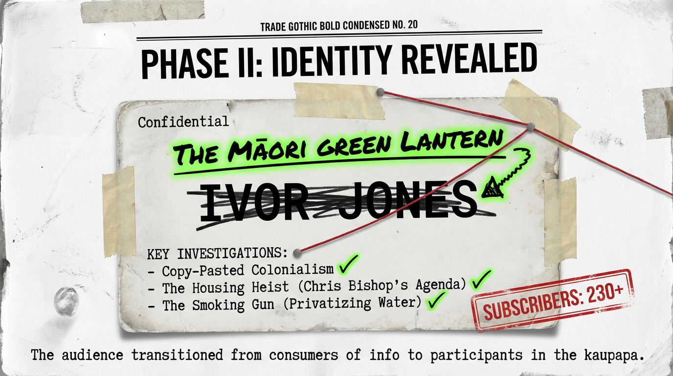 The shift showed up in the writing. I began to write not just about power, but from my own whakapapa and accountability. Pieces like “Copy-Pasted Colonialism: The Māori Green Lantern Investigation”, “The Housing Heist: How Chris Bishop’s Neoliberal Agenda Is Stealing Māori Futures”, and “The Smoking Gun: How Political Elites Plan to Privatize Your Water” were more than investigations.