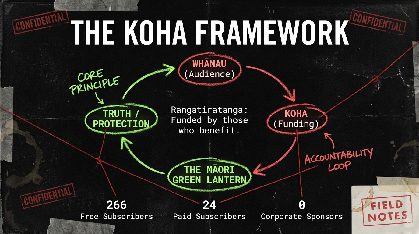 I do not frame this work as a product to be sold or a service to be monetised. I frame it as accountability journalism grounded in mātauranga Māori, offered to whānau, sustained by whānau. Those who see value in the mahi and have capacity to contribute do so through koha or paid subscription. Those who do not have capacity still receive every word, every investigation, every citation.