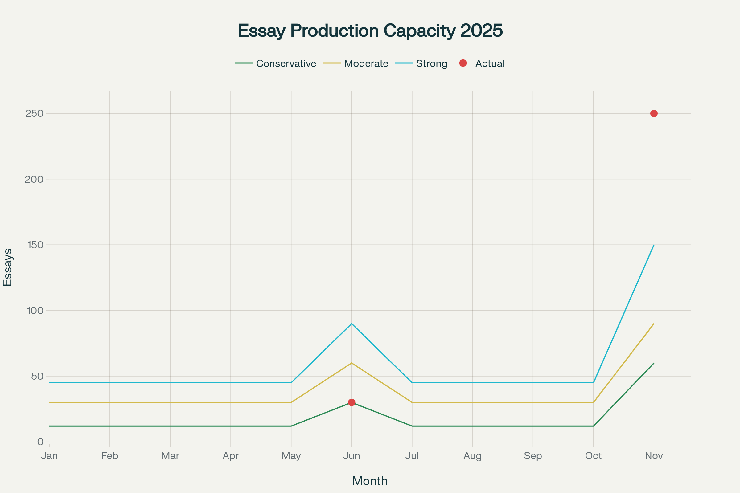 Line chart showing essay production month-by-month from January through November, with three scenarios: conservative baseline, moderate output, and strong capacity