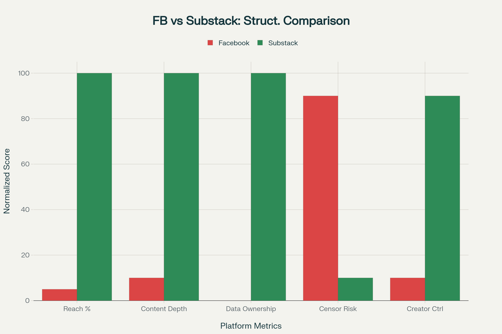 CHART 1: Facebook vs Substack Platform Comparison - Shows reach, content depth, data ownership, censorship risk, and creator control differences