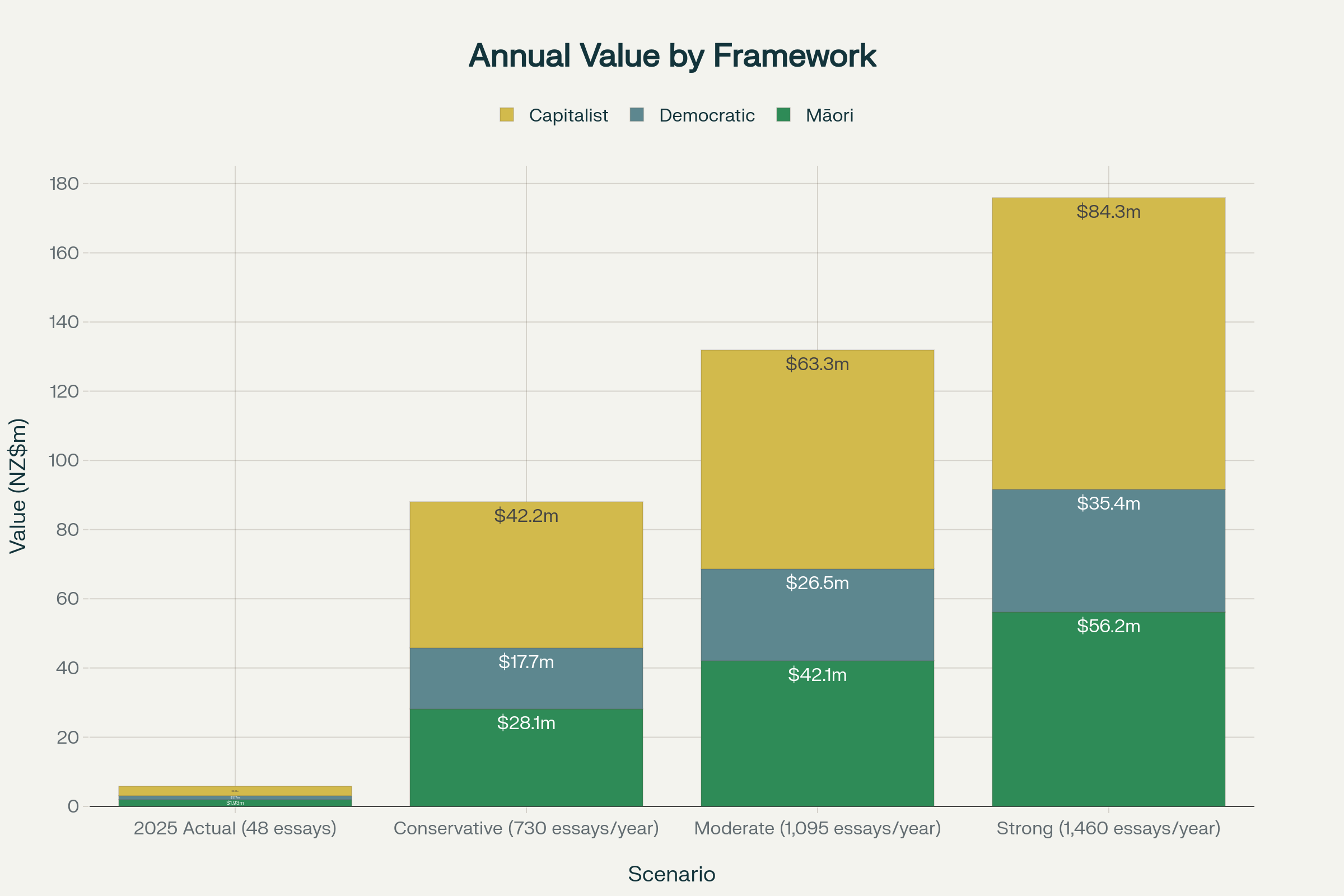 - Māori Framework: $1.93M-5.76M (representing movement infrastructure and collective liberation)