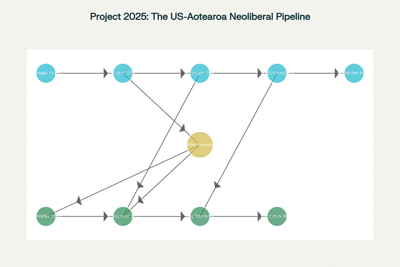 These aren’t isolated policies dreamed up by local politicians. They’re products of a coordinated international network. The Atlas Network—a global coalition of 550+ right-wing think tanks in 100+ countries—connects Heritage Foundation ideology to New Zealand’s political landscape(PSA, 2024). Three Atlas Network partners operate in Aotearoa: the New Zealand Initiative (formerly the Business Roundtable), the Taxpayers’ Union, and the Free Speech Union(ABC News, 2025).