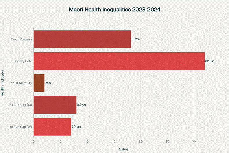 Māori experience severe health inequalities including 7-8 year lower life expectancy, double the adult mortality rate, and significantly higher rates of obesity and psychological distress compared to non-Māori.