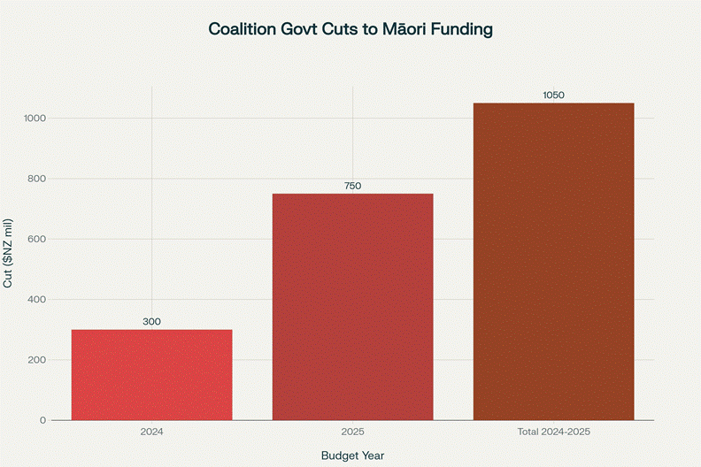 While Seymour builds his regulatory empire, the coalition government systematically defunds Māori communities. Budget 2024 cut $300 million from Māori-specific initiatives—Te Arawhiti, the Māori Health Authority, and Māori TV(Jackson, 2025). Budget 2025 slashed another $750 million, including $624 million from Māori housing through the Whai Kāinga Whai Oranga program, Māori economic development funds, Māori education initiatives, and Māori trades training(Jackson, 2025)(Te Ao News, 2025). Total damage: over $1.05 billion in two years.