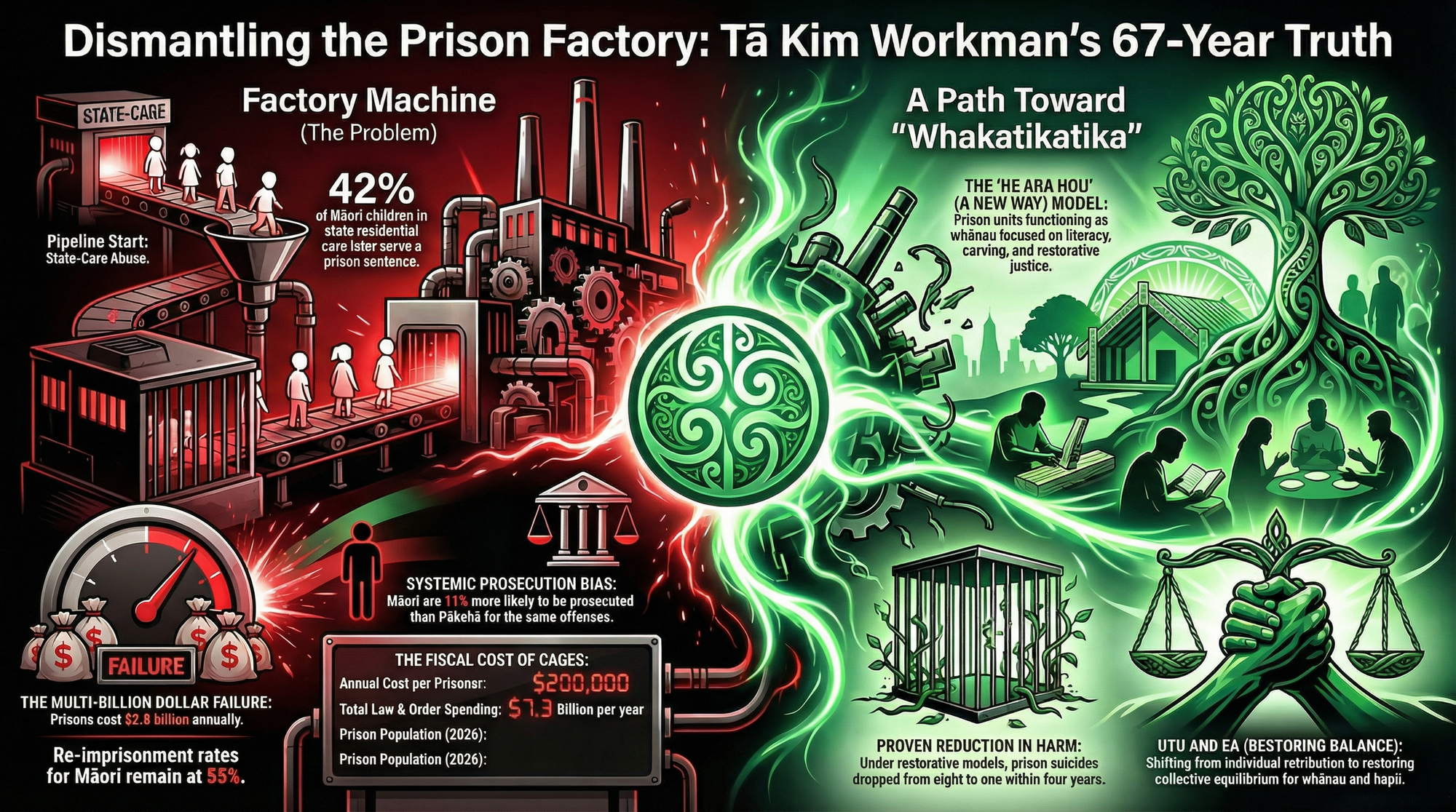 The Solution: Redirect prison expansion funding to community-based alternatives. Invest in therapeutic courts, Māori-led diversion programmes, and the whānau-centred reintegration models that Tā Kim demonstrated work. Adopt the New York model: reduce the prison population, invest in community safety, and watch crime fall. The evidence exists. The will does not — because the factory is profitable, and the bodies inside it vote Labour.