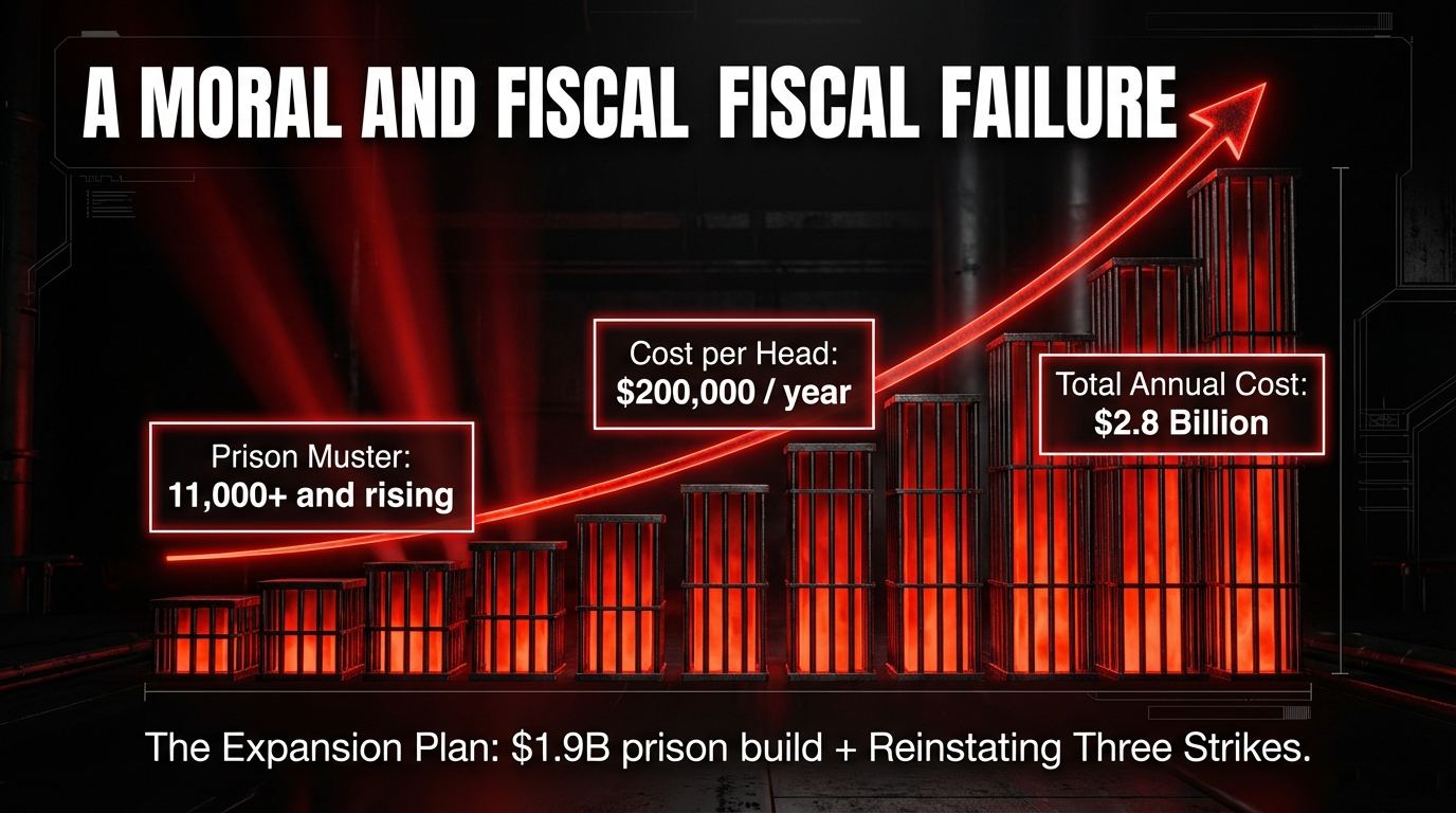 The Harm Quantified: At $200,000 per prisoner per year, the current muster of 11,000 costs $2.2 billion annually in Corrections costs alone. If the muster reaches the projected 14,000, annual Corrections costs approach $2.8 billion — before counting police, courts, and social costs. As one analysis noted, if just 25 courts each kept 50 defendants out of prison, that would reduce the population by 1,400 in one year — saving $280 million. Instead, this government builds more concrete boxes and calls it investment.
